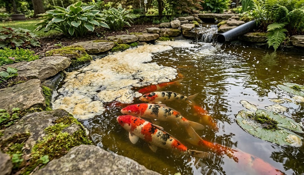 Głównym powodem „ubijania się” wody w pianę jest wysoki wskaźnik DOC (z ang. Dissolved Organic Carbon/Compounds) – czyli rozpuszczonych cząsteczek organicznych i białek. Skąd się biorą? Głównie z odchodów, resztek roślinnych, ale przede wszystkim z paszy. Jeśli w pełni sezonu mocno forsujesz karmienie karpi Koi (stosując diety wysokobiałkowe dla szybkiego wzrostu), część wydalonego białka niewidocznie rozpuszcza się w wodzie.