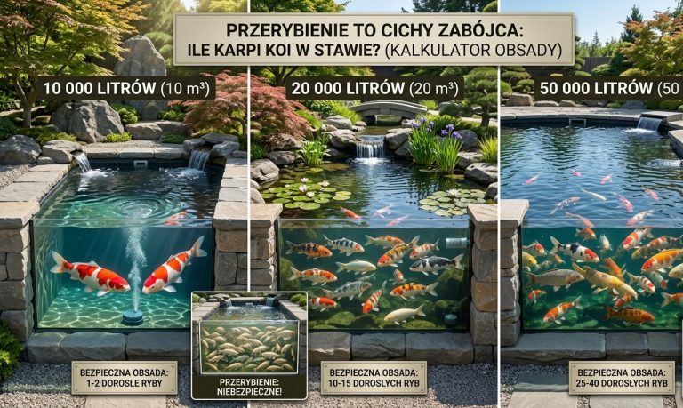 W kwaśnej wodzie (np. pH 6.0) amoniak występuje w formie zjonizowanej (jon amonowy NH4+), która jest praktycznie nieszkodliwa. Jeśli jednak masz w wodzie dużo amoniaku i nagle sztucznie podbijesz pH do 8.0, ten bezpieczny jon ułamku sekundy zamieni się w trujący amoniak (NH3) – niewidzialnego mordercę. Zanim zaczniesz podnosić pH, koniecznie wstrzymaj karmienie karpi Koi (by nie dokładać białka do systemu) i sprawdź kropelkowo, czy woda jest wolna od związków azotu!